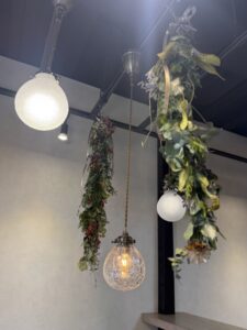 店内の天井には、自然素材を束ねたガーランドを飾りました。